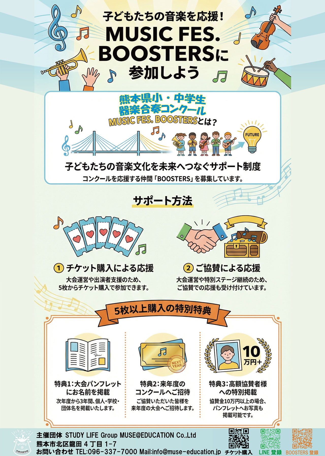 熊本県小・中学校器楽合奏コンクール Music Fes, Competitionを開催します。この歴史ある器楽合奏コンクールは、小学校は第67回、中学校は第56回を迎えます。小・中学校の重要な音楽表現の場です。子どもたちの希望に満ちたステージが展開されていくよう、新たに「器楽合奏部門・ミュージックパフォーマンス部門・BGM、テーマ曲部門」の3つの部門を新設しました。